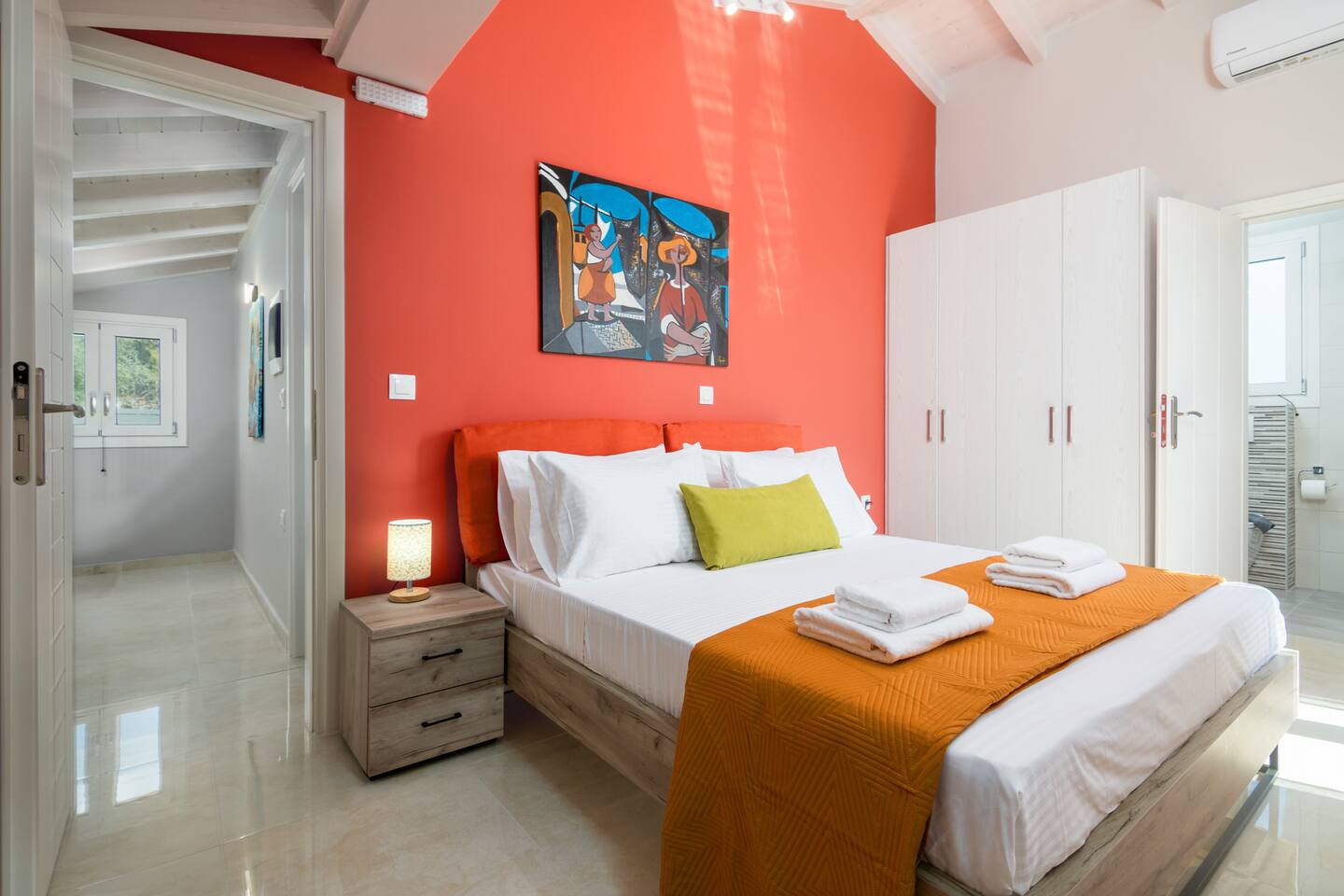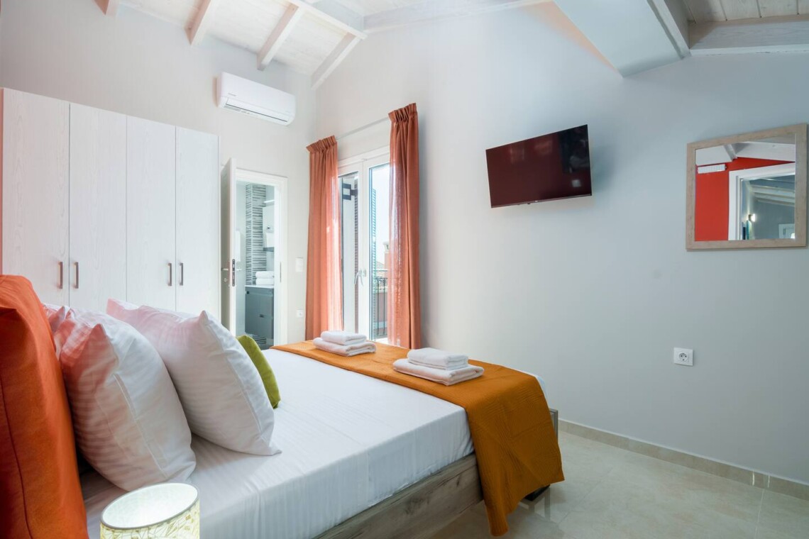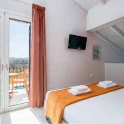 Ascend to the upper level where you’ll discover two more bedrooms, each boasting a double bed, smart TV, and en-suite bathrooms equipped with shower and hydromassage shower column. Ample wardrobe space ensures your comfort and convenience throughout your stay.