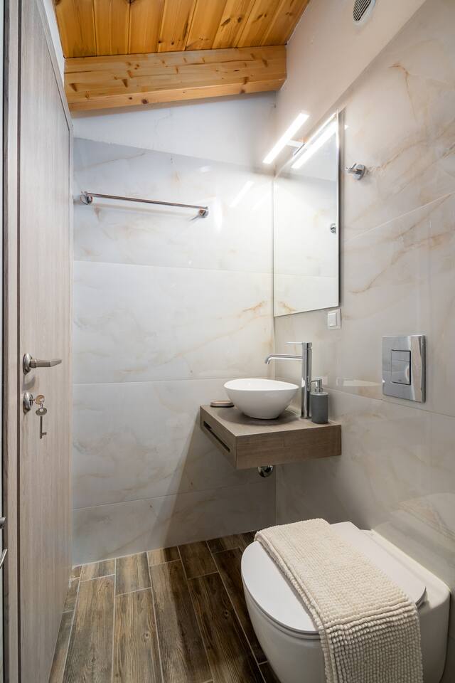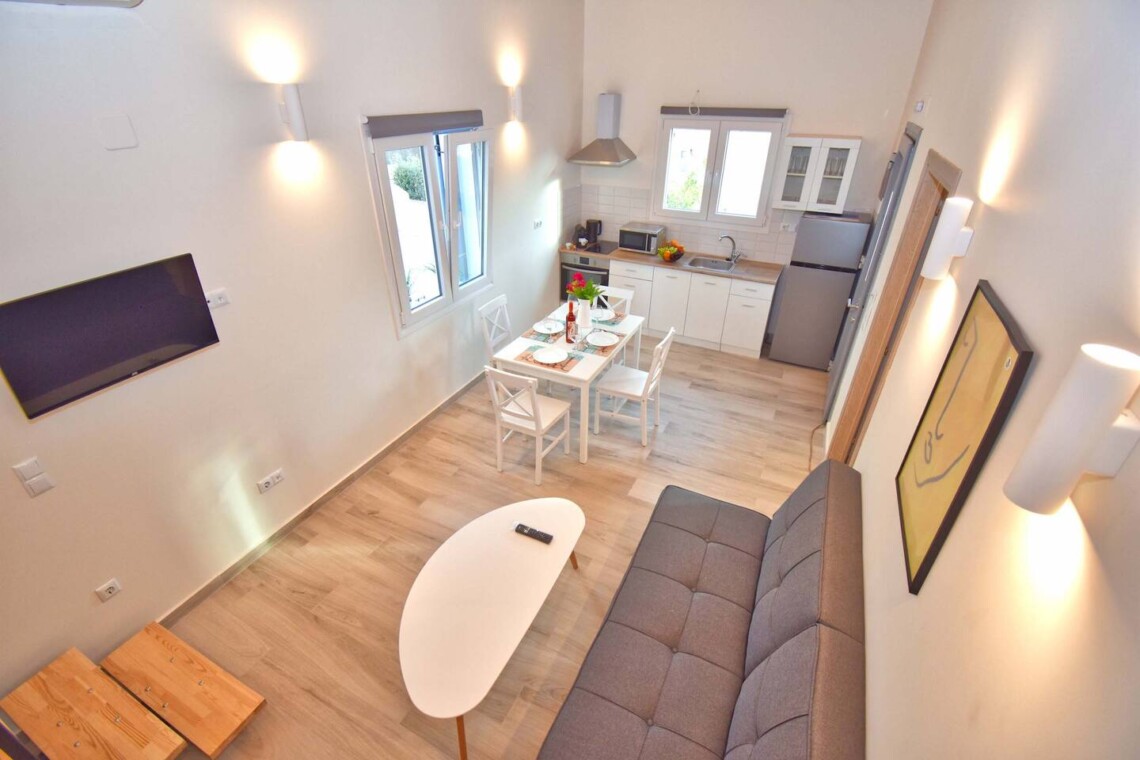 The Apartment is a 70sqm ground floor, fully equipped for ultimate comfort. It consists of one bedroom with queen size bed on the ground floor and another double bed on the first floor. The ground floor with the first floor communicate with an internal modern wooden staircase. You will find anatomic mattress, bathroom, air-conditioned living room with smart TV, fully equipped kitchen with all cooking facilities and dining area. Ideal for couples and families