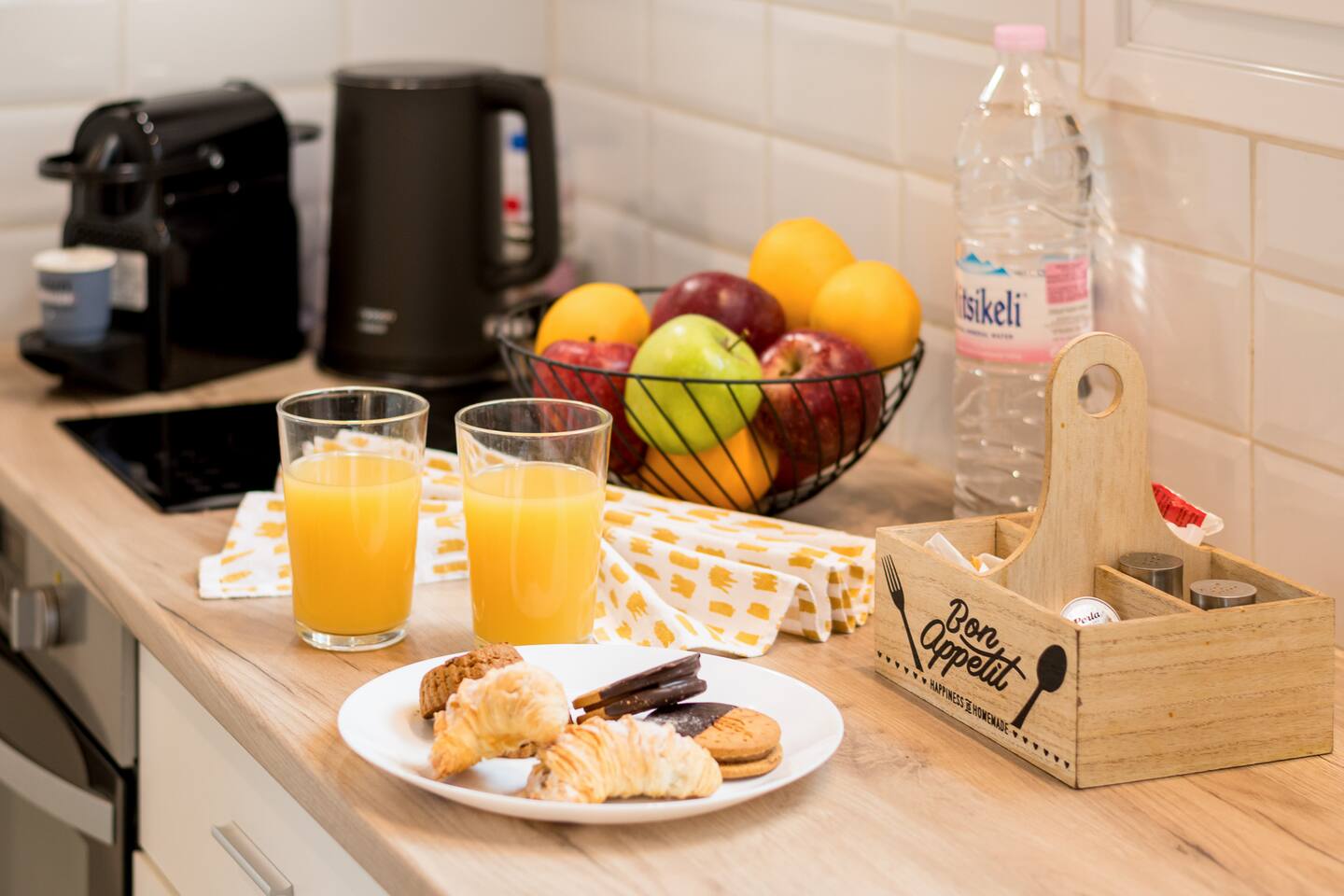 KITCHEN: The KITCHEN is equipped with the most modern equipment and everything you need to prepare great meals with, electric hot plates, toaster, refrigerator, kettle, nespresso coffee maker with pods. We also provide essentials like tea, coffee, and cooking oils.